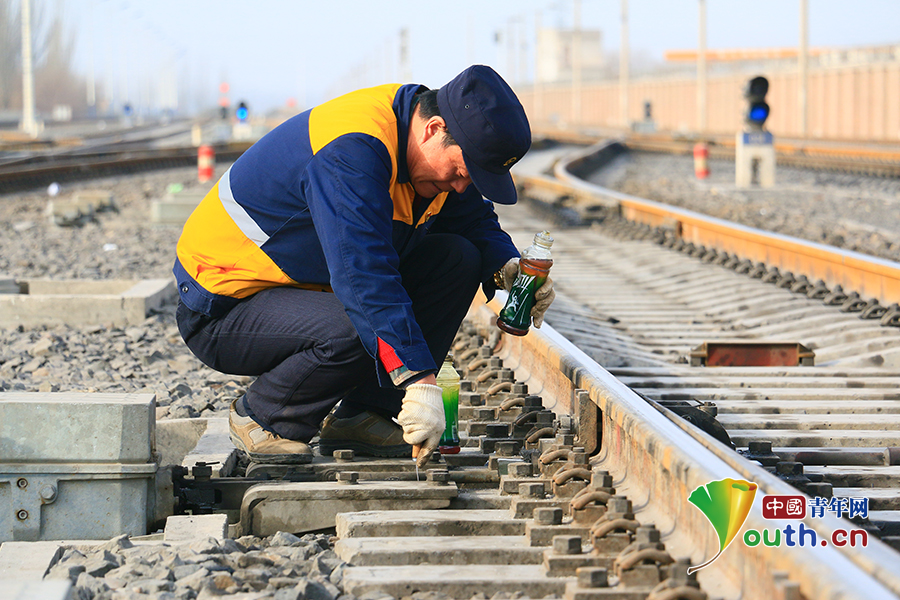 農歷正月初八這天,邰芳鵬和工區3名年輕職工一同到現場,對阿克蘇站信號機和道岔進行巡視檢查。中國青年網通訊員 姚旭東 攝