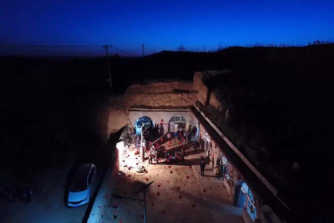 2月22日,在山西省永和縣奇奇里村,村民們?cè)跒轳T文忠的婚禮準(zhǔn)備菜品(無(wú)人機(jī)拍攝)新華社記者 詹彥 攝
