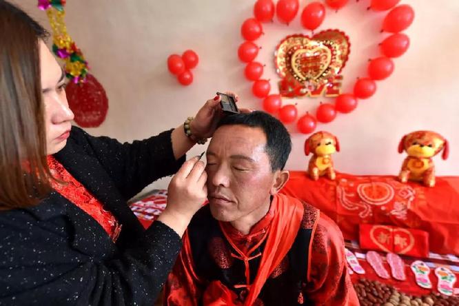 2月23日,在山西省永和縣奇奇里村,一位村民在幫新郎馮文忠化妝。新華社記者 曹陽(yáng) 攝