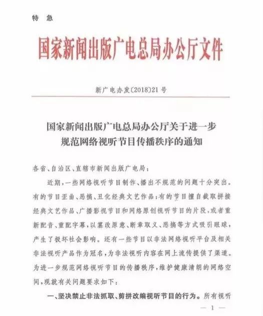 3月22日,國家廣電總局發(fā)布《關(guān)于進(jìn)一步規(guī)范網(wǎng)絡(luò)視聽節(jié)目傳播秩序的通知》。