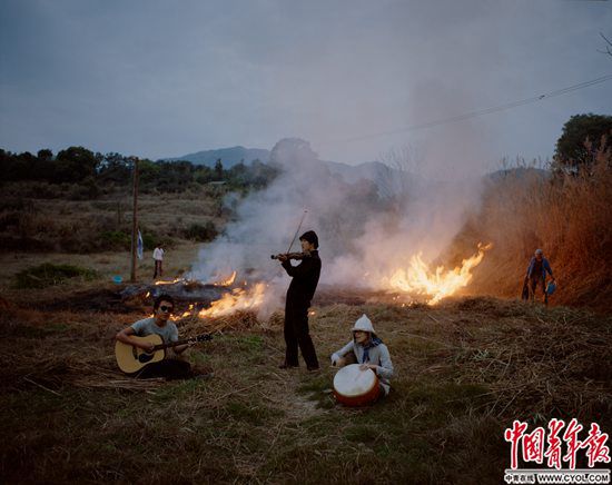 3月14日傍晚,福建省福州市閩侯縣關(guān)中村,“南部生活”共識社區(qū)成員在墾荒前將蘆葦和野草燒掉,日本建筑師吉富遙樹、社區(qū)發(fā)起人唐冠華和邢振(左至右)見到燒荒的場景,臨時起意來到現(xiàn)場演奏。