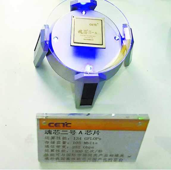 2012年,中國電科38所推出我國自主研發的首款實用型高性能浮點通用DSP(數字信號處理器)芯片——“魂芯一號”。 “魂芯一號”每秒能完成300億次浮點運算或80億次浮點乘法累加運算,可謂真正的中國“芯”、民族“魂”,其成功應用打破了國外高性能芯片在中國的壟斷地位。就性能而言,“魂芯一號”的性能高于同期市場同類DSP芯片3倍至4倍,并成功應用在我國空警-500預警機雷達等多個國防科技裝備上,讓空警-500實現了“小平臺、大預警、高性能、新一代”的戰略目標,成為我國首款廣泛應用于國防科技裝備的高端自主數字信號處理器。