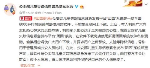 公安部兒童失蹤信息緊急發布“團圓”系統鄭重聲明,該軟件與公安部兒童失蹤信息緊急發布平臺無任何關聯,而且警方不會讓群眾上傳個人信息,請大家注意識別并保護好自己的個人信息安全。