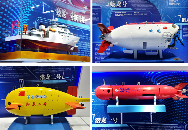 這是國家深海基地“走向深海”展廳內(nèi)陳列的我國各類科研設(shè)備模型(拼版照片,2017年12月19日攝)。新華社記者 李紫恒 攝