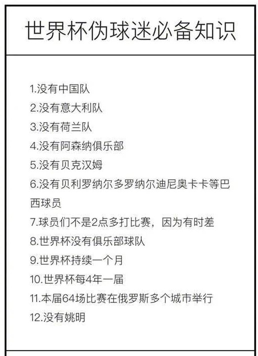 女:今天中午居然有同事問我“阿森納參不參加世界杯”。阿森納當然不參加了,世界杯沒有俱樂部球隊。