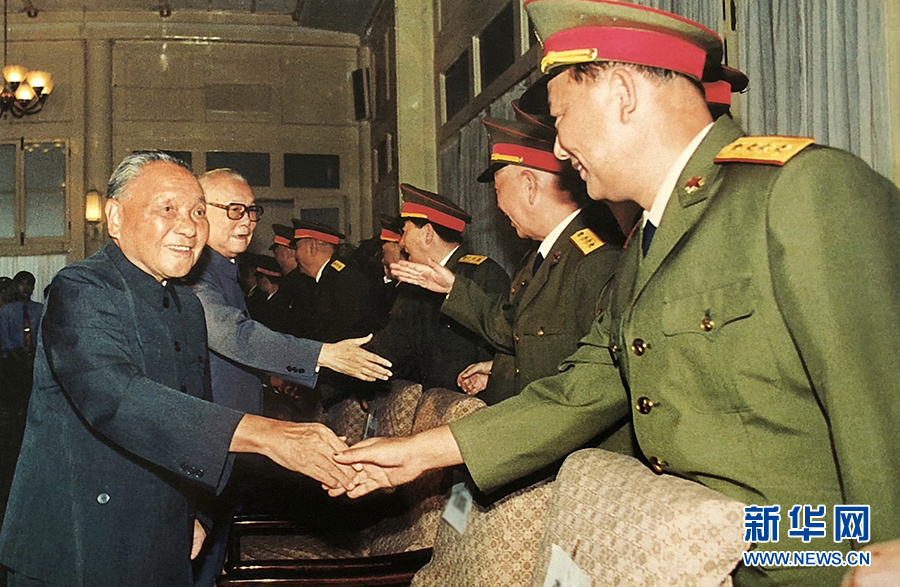 1988年9月,鄧小平同志與被授予上將軍銜的趙南起同志握手。新華社發(fā)
