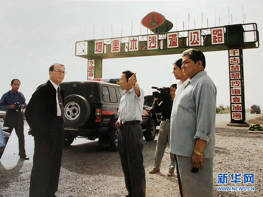 1999年,趙南起同志率全國政協(xié)防治荒漠化調(diào)研組在新疆塔里木沙漠公路調(diào)研。新華社發(fā)