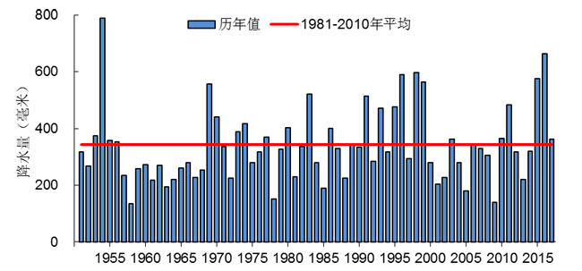 1951-2017年我國梅雨量歷年變化