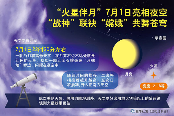 圖表:“火星伴月”7月1日亮相夜空 “戰神”聯袂“嫦娥”共舞蒼穹 新華社發 邊紀紅 制圖