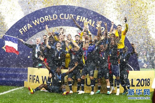 圖為2018年7月15日,在莫斯科進行的2018俄羅斯世界杯足球賽決賽中,法國隊球員在頒獎儀式上慶祝。法國隊以4比2戰(zhàn)勝克羅地亞隊,繼1998年后再奪世界杯冠軍。新華社記者曹燦 攝