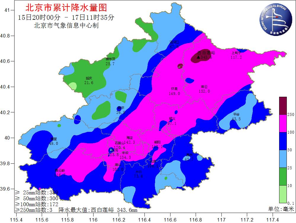 根據氣象觀測,15日20時至17日8時,北京市平均降水量達77.7毫米,城區平均100.9毫米,全市453個氣象觀測站中有121個超過100毫米、12個超過200毫米。其中,密云有2個測站超過300毫米,分別是西白蓮峪達(336毫米)和捧河巖村(302毫米)。