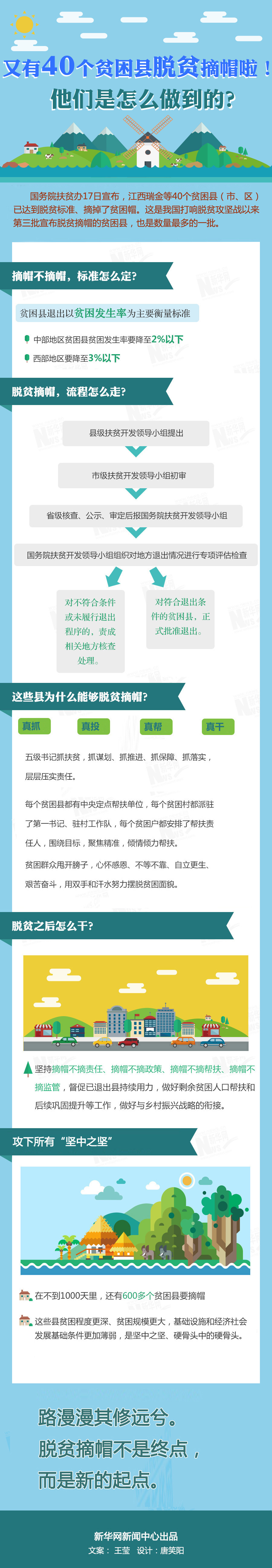 “我們清醒地看到,這40個貧困縣脫貧摘帽,只是他們脫貧攻堅的階段性成果,僅初步解決了區域性整體貧困,摘帽的貧困縣都有尚未脫貧的貧困人口,最多的縣還有近兩萬人,大多是貧困老年人、重病患者、重度殘疾人等,脫貧難度更大。”夏更生表示,將堅持摘帽不摘責任、摘帽不摘政策、摘帽不摘幫扶、摘帽不摘監管,督促已退出縣持續用力。