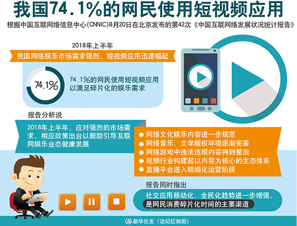 新華社北京8月20日電(記者施雨岑、王思北)根據(jù)中國(guó)互聯(lián)網(wǎng)絡(luò)信息中心(CNNIC)20日在京發(fā)布的第42次《中國(guó)互聯(lián)網(wǎng)絡(luò)發(fā)展?fàn)顩r統(tǒng)計(jì)報(bào)告》,2018年上半年,我國(guó)網(wǎng)絡(luò)娛樂(lè)市場(chǎng)需求強(qiáng)烈,短視頻應(yīng)用迅速崛起,74.1%的網(wǎng)民使用短視頻應(yīng)用,以滿足碎片化的娛樂(lè)需求。