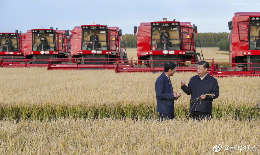 25日下午,首個“中國農民豐收節”剛過,習近平就深入三江平原腹地黑龍江農墾建三江管理局,考察糧食生產和收獲情況。他邊聽介紹,邊向農場負責人詢問今年收成如何、有沒有病蟲害、能否做到連年豐收,并強調中國人的飯碗任何時候都要牢牢端在自己的手上。在北大荒精準農業農機中心一樓大廳,當地出產的米油豆奶等各類農產品擺滿展臺。習近平走近前去,雙手捧起一碗大米,意味深長地說:“中國糧食,中國飯碗。”(文字:張曉松 攝影:謝環馳)