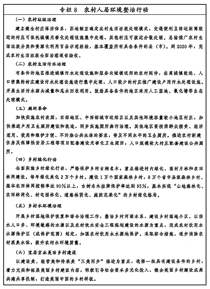 推進農村生活垃圾治理,建立健全符合農村實際、方式多樣的生活垃圾收運處置體系,有條件的地區推行垃圾就地分類和資源化利用。開展非正規垃圾堆放點排查整治。實施“廁所革命”,結合各地實際普及不同類型的衛生廁所,推進廁所糞污無害化處理和資源化利用。梯次推進農村生活污水治理,有條件的地區推動城鎮污水管網向周邊村莊延伸覆蓋。逐步消除農村黑臭水體,加強農村飲用水水源地保護。