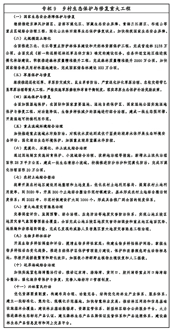 統籌山水林田湖草系統治理,優化生態安全屏障體系。大力實施大規模國土綠化行動,全面建設三北、長江等重點防護林體系,擴大退耕還林還草,鞏固退耕還林還草成果,推動森林質量精準提升,加強有害生物防治。穩定擴大退牧還草實施范圍,繼續推進草原防災減災、鼠蟲草害防治、嚴重退化沙化草原治理等工程。保護和恢復鄉村河湖、濕地生態系統,積極開展農村水生態修復,連通河湖水系,恢復河塘行蓄能力,推進退田還湖還濕、退圩退垸還湖。大力推進荒漠化、石漠化、水土流失綜合治理,實施生態清潔小流域建設,推進綠色小水電改造。加快國土綜合整治,實施農村土地綜合整治重大行動,推進農用地和低效建設用地整理以及歷史遺留損毀土地復墾。加強礦產資源開發集中地區特別是重有色金屬礦區地質環境和生態修復,以及損毀山體、礦山廢棄地修復。加快近岸海域綜合治理,實施藍色海灣整治行動和自然岸線修復。實施生物多樣性保護重大工程,提升各類重要保護地保護管理能力。加強野生動植物保護,強化外來入侵物種風險評估、監測預警與綜合防控。開展重大生態修復工程氣象保障服務,探索實施生態修復型人工增雨工程。