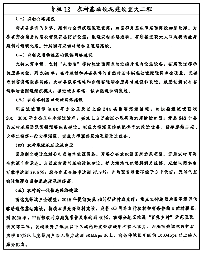繼續把基礎設施建設重點放在農村,持續加大投入力度,加快補齊農村基礎設施短板,促進城鄉基礎設施互聯互通,推動農村基礎設施提擋升級。