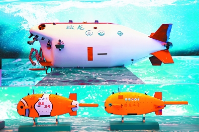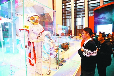 “可上九天攬月,可下五洋捉鱉”。一邊是航天技術(shù)展區(qū),一邊是航海技術(shù)展區(qū),完美對應(yīng)著詩句,一上一下,延展著人類對于世界的認知和想象。天宮二號空間實驗室、嫦娥三號月球探測器以及蛟龍、海龍、潛龍“三龍兄弟”深海探測裝備模型,讓很多在場的孩子發(fā)出贊嘆之聲。