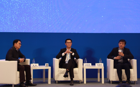 第五屆世界互聯(lián)網(wǎng)大會(huì)企業(yè)家高峰對(duì)話分論壇,高瓴資本張磊(左)、騰訊馬化騰(中)、百度李彥宏(右)
