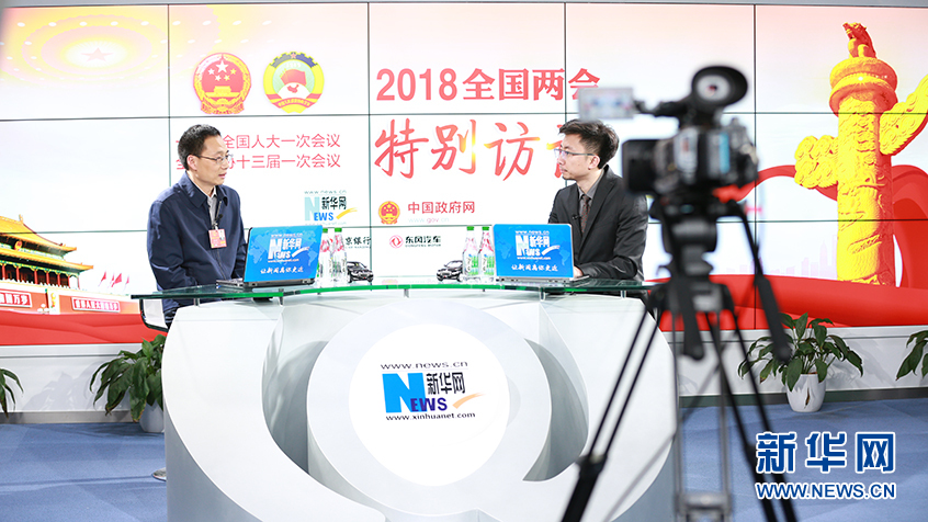 3月6日,全國人大代表、湖北省荊州市市長崔永輝(左)做客新華網2018全國兩會特別訪談。新華網 楊锘攝