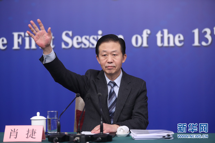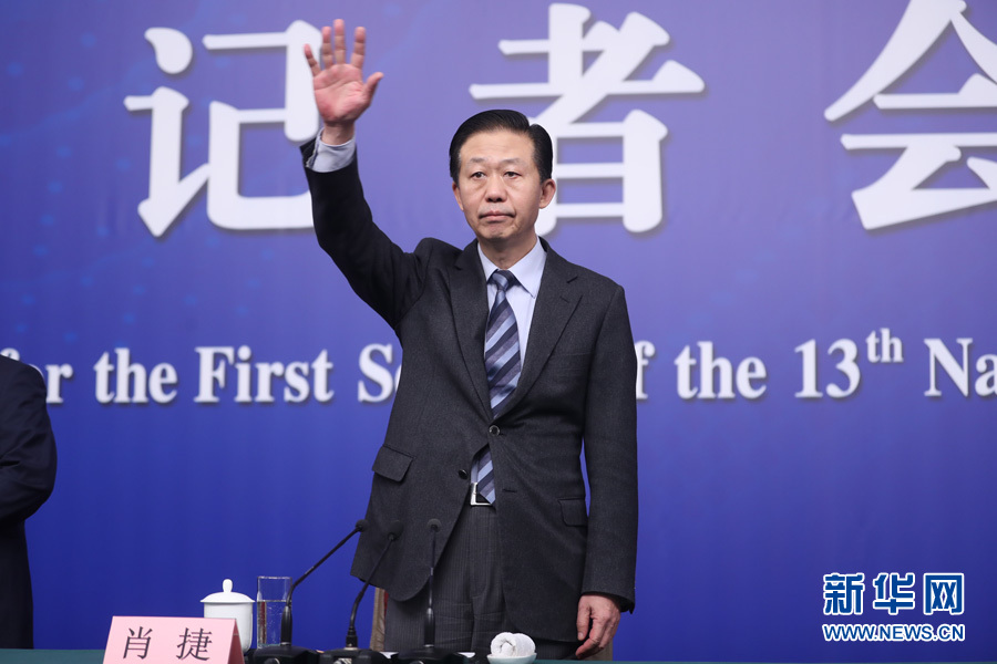 十三屆全國人大一次會議新聞中心于3月7日上午在梅地亞中心多功能廳舉行記者會,邀請財政部部長肖捷,副部長史耀斌、胡靜林就“財稅改革和財政工作”相關問題回答中外記者提問。圖為財政部部長肖捷向記者舉手示意。新華網/中國政府網 翟子赫 攝