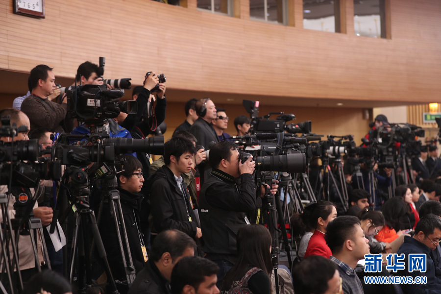 十三屆全國人大一次會議新聞中心于3月7日在梅地亞中心多功能廳舉行記者會,邀請農業部部長韓長賦,農業部新聞發言人、辦公廳主任潘顯政就“實施鄉村振興戰略 推動農業轉型升級”的相關問題回答中外記者的提問。圖為記者在現場拍攝。新華網/中國政府網 陳杰 攝