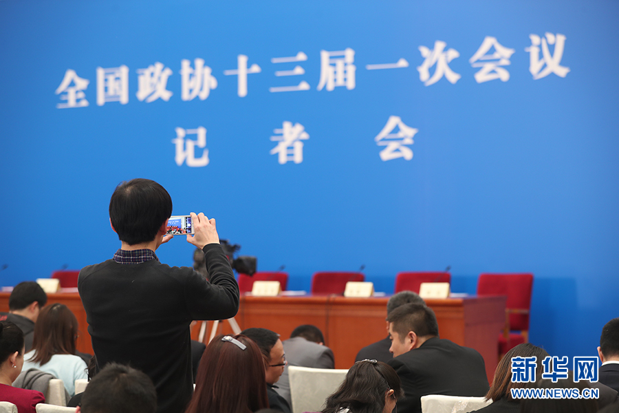全國政協十三屆一次會議3月8日15:00在人民大會堂新聞發布廳舉行第二場記者會,邀請中央財經領導小組辦公室副主任楊偉民,中國進出口銀行董事長、黨委書記胡曉煉,農業部原副部長陳曉華,全國工商聯副主席、清華大學經濟管理學院院長錢穎一,中國中化集團有限公司黨組書記、董事長寧高寧就推動經濟高質量發展回答記者提問。圖為記者在現場拍攝。新華網/中國政府網 翟子赫 攝?