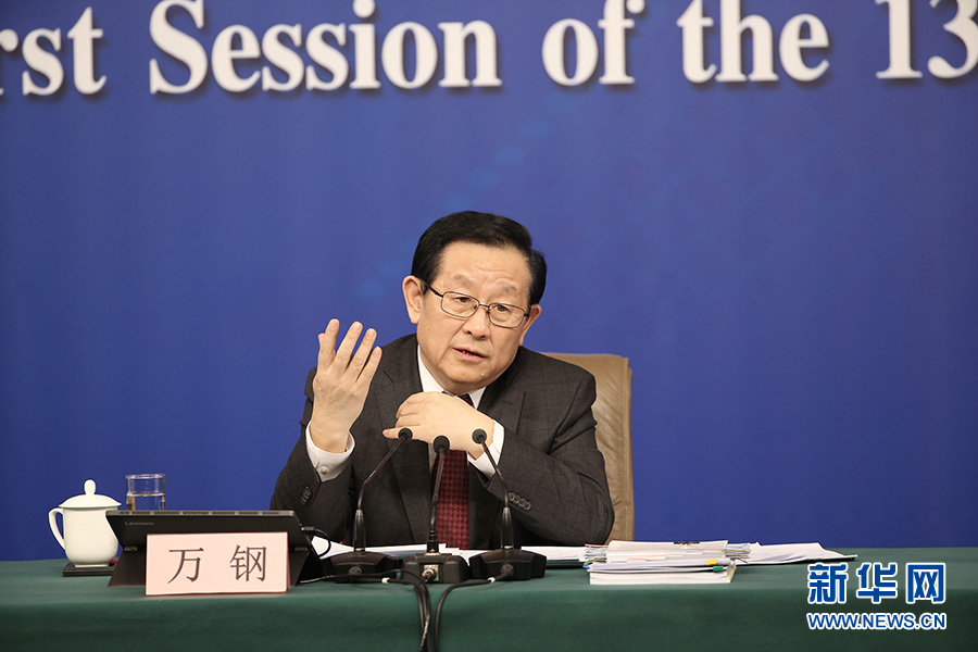 十三屆全國人大一次會議新聞中心3月10日上午10時45分在梅地亞中心多功能廳舉行記者會,邀請科技部部長萬鋼、政策法規與監督司司長賀德方、創新發展司司長許倞就“加快建設創新型國家”相關問題回答中外記者提問。圖為萬鋼回答記者提問。 新華網/中國政府網 陳杰 攝