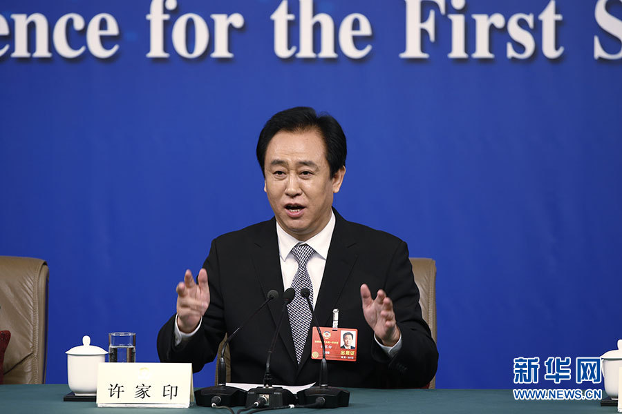 3月10日8時45分,全國政協十三屆一次會議在梅地亞中心多功能廳舉行記者會,邀請5位全國政協委員就“提高保障和改善民生水平”回答記者提問。圖為許家印回答記者提問。新華網/中國政府網?陳杰 攝