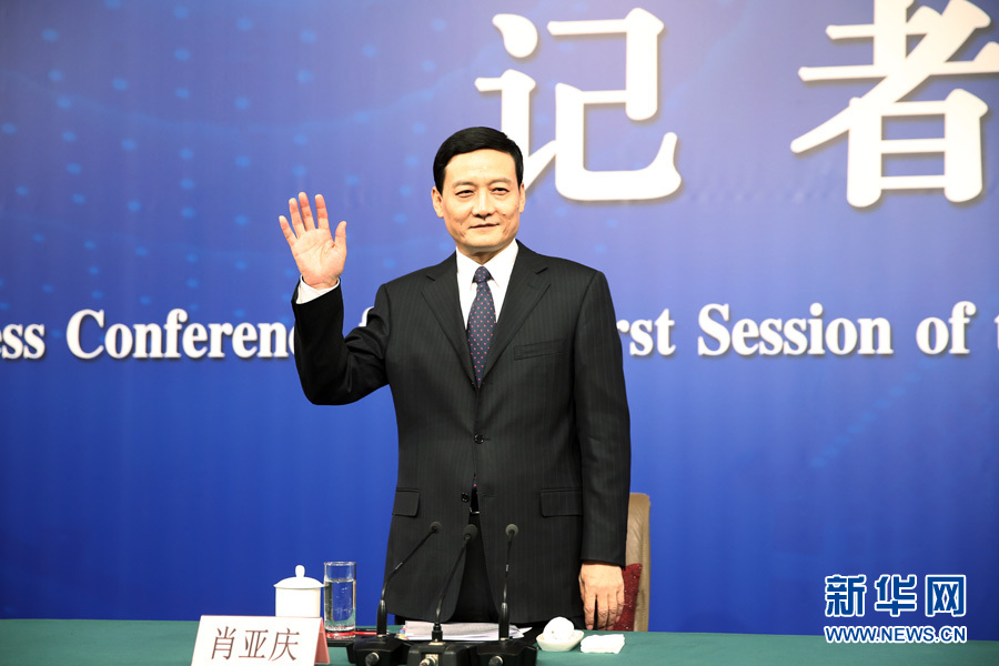 十三屆全國人大一次會議新聞中心3月10日15時在梅地亞中心多功能廳舉行記者會,邀請國務院國資委主任肖亞慶,副秘書長、新聞發言人彭華崗就“國有企業改革發展”相關問題回答中外記者提問。圖為肖亞慶向記者示意。新華網/中國政府網 翟子赫 攝