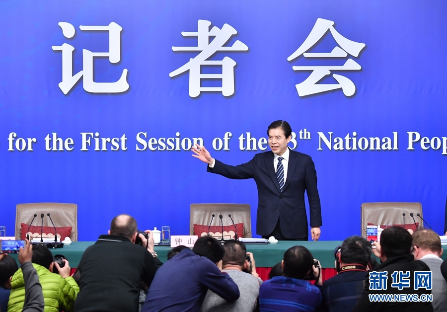 3月11日,十三屆全國人大一次會議新聞中心舉行記者會,邀請商務部部長鐘山、副部長兼國際貿易談判副代表王受文、副部長錢克明就“推動形成全面開放新格局推動商務事業高質量發展”相關問題回答中外記者提問。這是鐘山向記者揮手致意。 新華社記者 李鑫 攝
