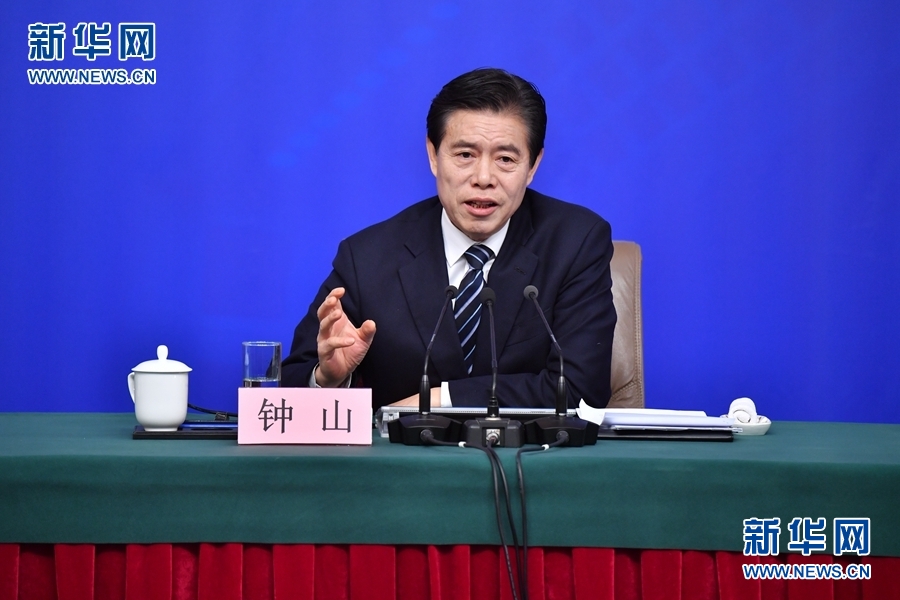 3月11日,十三屆全國人大一次會議新聞中心舉行記者會,邀請商務部部長鐘山、副部長兼國際貿易談判副代表王受文、副部長錢克明就“推動形成全面開放新格局推動商務事業(yè)高質量發(fā)展”相關問題回答中外記者提問。這是鐘山在回答記者提問。 新華社記者 李鑫 攝