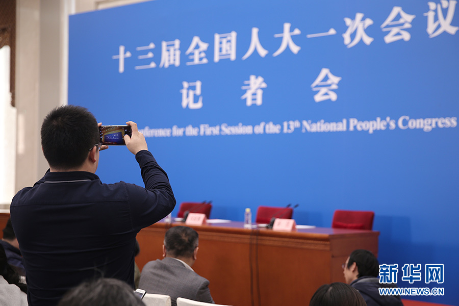 3月11日,十三屆全國人大一次會議新聞中心在人民大會堂一樓新聞發布廳舉行記者會,邀請十三屆全國人大一次會議秘書處法案組組長、全國人大常委會法工委主任沈春耀,法案組副組長、全國人大常委會法工委副主任鄭淑娜就“憲法修正案”相關問題回答中外記者提問。圖為記者會開始前記者在現場拍攝。新華網/中國政府網?翟子赫 攝