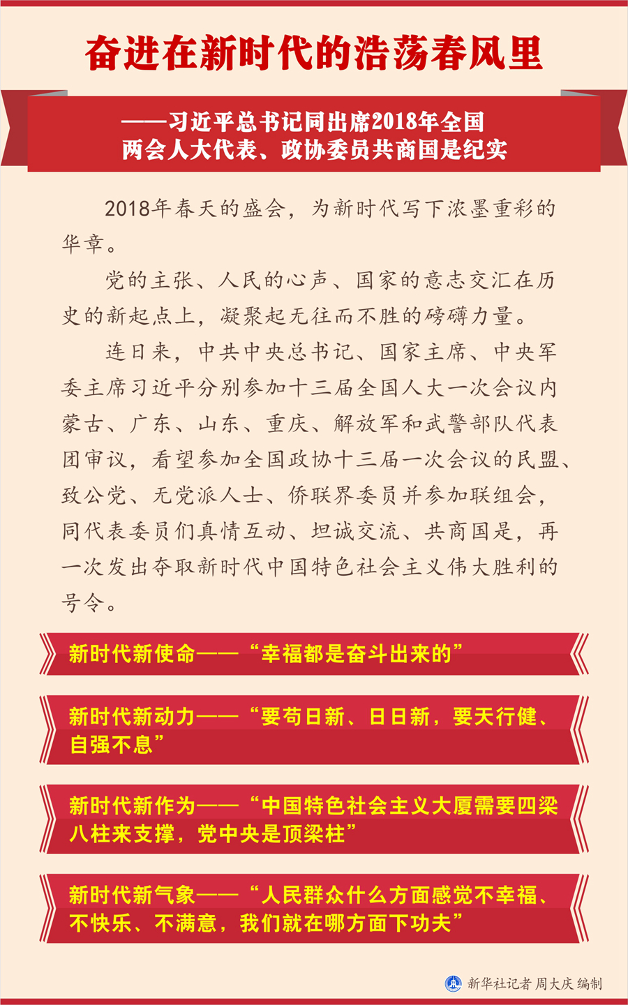 圖表:奮進(jìn)在新時(shí)代的浩蕩春風(fēng)里——習(xí)近平總書(shū)記同出席2018年全國(guó)兩會(huì)人大代表、政協(xié)委員共商國(guó)是紀(jì)實(shí) 新華社記者 周大慶 編制