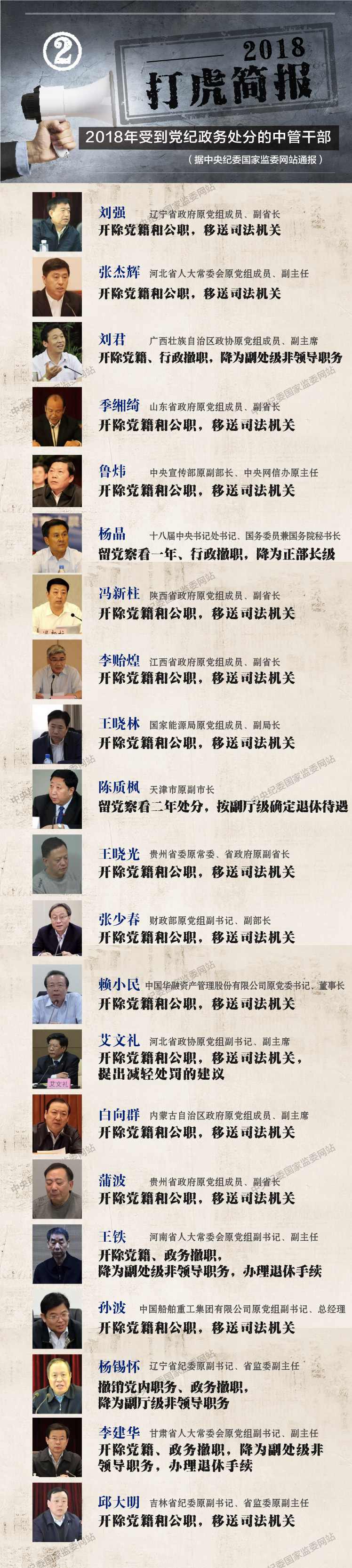——嚴重違紀、嚴重觸犯刑律的黨員必須開除黨籍;涉及嚴重違法犯罪,必須移送司法機關(guān)。2018年公布處理結(jié)果的21名中管干部里,18人被開除黨籍,15人被移送檢察機關(guān)審查起訴。