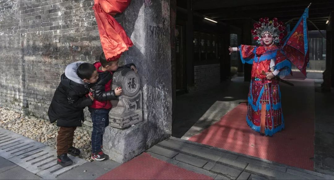 2019-02-03,山東省莒縣。兩位小朋友悄悄地趴在石獅上,期待著戲曲表演節(jié)目。作者:泉城
