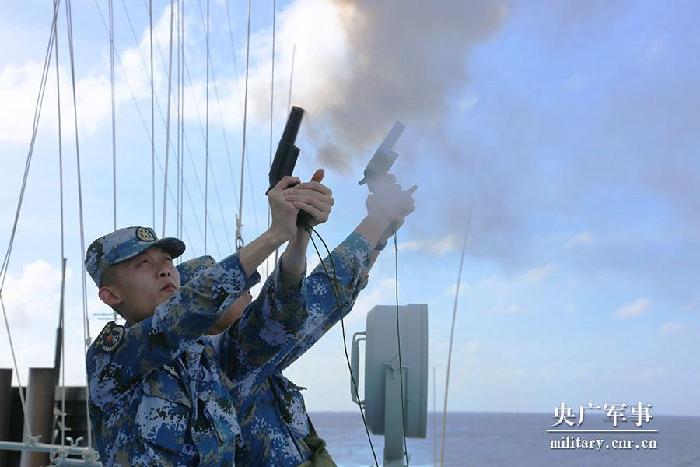 “砰!砰”,在喊話和警告射擊未果后,合肥艦又發出2枚信號彈,模擬實施攔阻射擊。此時,可疑商船終于放棄“抵抗”,減速停車。