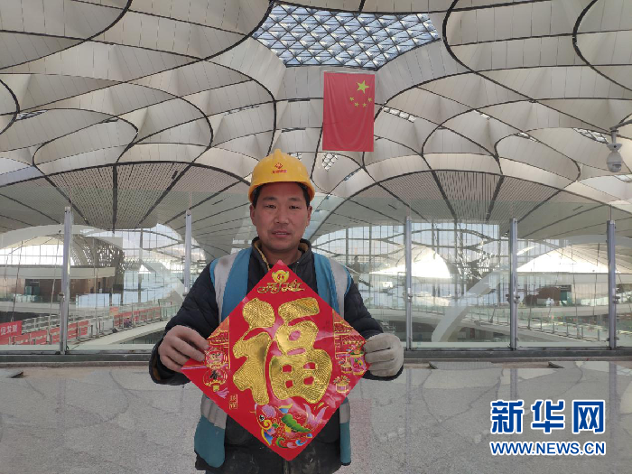 圖片說(shuō)明:大興機(jī)場(chǎng)航站樓春節(jié)期間值守的工人舉起了“?!弊帧?攝影:新華網(wǎng)錢(qián)春弦