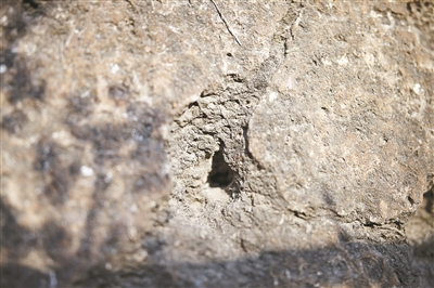 寶頂的三合土表面,疑為盜墓人用鐵釬打下的探孔