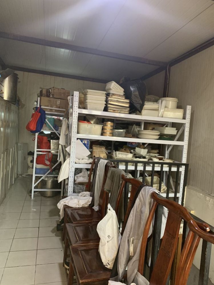 入職當天,記者在飯店三樓看到,擺放餐具的倉庫同時被安排為員工的更衣室。員工的衣物和蒙塵的餐具一同被隨意擺放在儲物架上。