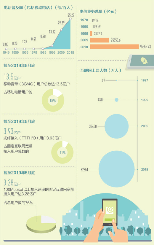 從單一種類到多種通信方式并存。2018年,我國電話普及率(包括移動電話)為125.29部/百人,固定互聯網寬帶接入用戶40738萬戶,移動寬帶用戶130565萬戶,互聯網上網人數從1997年的62萬人迅速上升至82851萬人。用得上、用得起、用得好的信息服務正在惠及更多百姓,億萬人民在共享互聯網發展成果上擁有更多獲得感、幸福感和安全感。