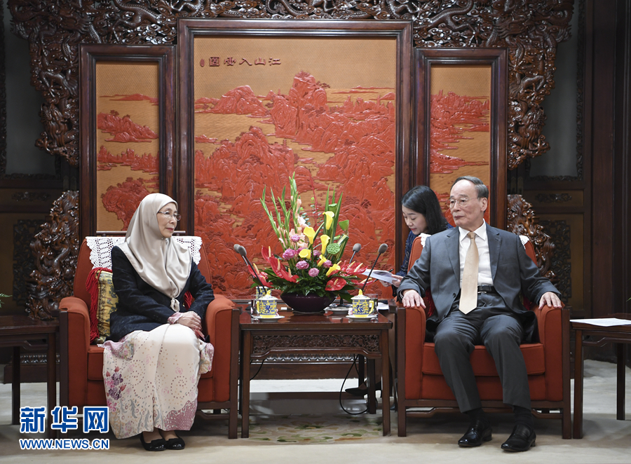 7月9日,國家副主席王岐山在北京中南海會(huì)見馬來西亞副總理旺·阿茲莎。 新華社記者 張領(lǐng) 攝
