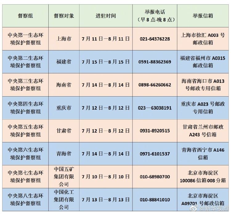 15日,隨著中央第二生態(tài)環(huán)境保護(hù)督察組進(jìn)駐福建省,第二輪第一批中央生態(tài)環(huán)境保護(hù)督察8個(gè)督察組已經(jīng)全部進(jìn)駐。在對6省份、2央企進(jìn)行為期一個(gè)月的督察中,公眾可以向督察組舉報(bào)相關(guān)省份、企業(yè)生態(tài)環(huán)境方面的問題。這份舉報(bào)方式請收好!(記者高敬)