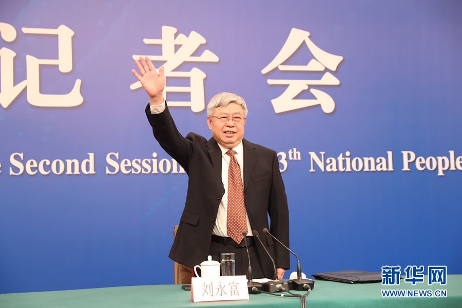 十三屆全國人大二次會議新聞中心于3月7日10時50分在梅地亞中心新聞發布廳舉行記者會,邀請國務院扶貧開發領導小組辦公室主任劉永富就“攻堅克難——堅決打贏脫貧攻堅戰”相關問題回答中外記者提問。圖為劉永富向記者們揮手示意。新華網 陳杰 攝