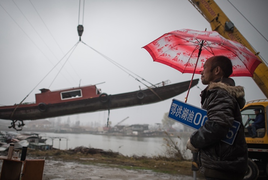 在長江新螺段白鱀豚國家級自然保護區漁船拆解現場,漁民夏明星注視著被吊起的漁船(2019年12月25日攝)。新華社記者?肖藝九/攝