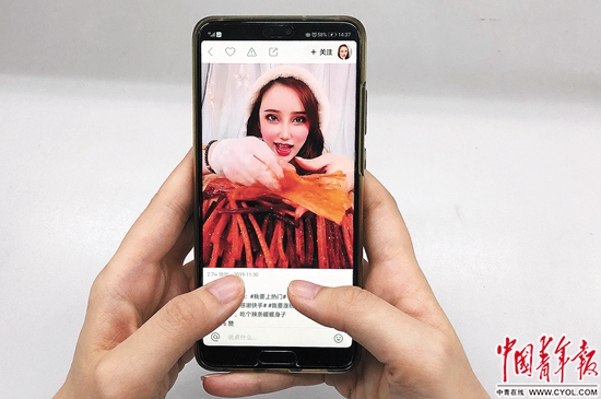 一位消費者在查看手機里關(guān)于網(wǎng)紅食品的視頻。中青報·中青網(wǎng)記者 李崢苨/攝