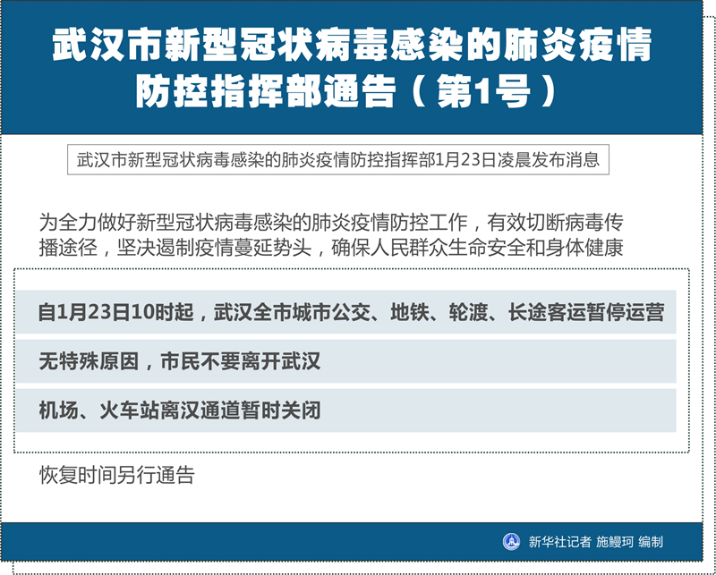 新華社武漢1月23日電(記者馮國棟)武漢市新型冠狀病毒感染的肺炎疫情防控指揮部1月23日凌晨發(fā)布消息,為全力做好新型冠狀病毒感染的肺炎疫情防控工作,有效切斷病毒傳播途徑,堅決遏制疫情蔓延勢頭,確保人民群眾生命安全和身體健康,自1月23日10時起,武漢全市城市公交、地鐵、輪渡、長途客運暫停運營;無特殊原因,市民不要離開武漢;機場、火車站離漢通道暫時關閉。恢復時間另行通告。