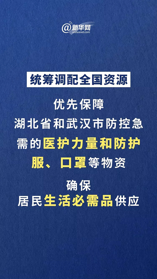 會議強調,要突出重點,進一步加強湖北省和武漢市疫情防控。中央向湖北派出指導組,推動加強防控一線工作。統籌調配全國資源,優先保障湖北省和武漢市防控急需的醫護力量和防護服、口罩等物資,確保居民生活必需品供應,物資調運實行綠色通道。湖北省和武漢市要層層落實責任,加快建設集中收治醫院、改造酒店作為隔離區,做好發熱病人及時診治,防范發生次生問題。加強醫護人員輪換和防護,緩解他們的身體和心理壓力。嚴格做好城鄉結合部、省市邊界人流進出管理,做到外防輸出、內防擴散。