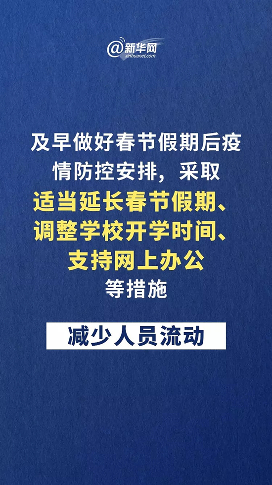 會議要求,要加強分類指導,壓實屬地責任,精準有效科學防控。各地要成立應對疫情工作領導小組,黨政主要負責人要親自掛帥,防控工作不得有誤。加強疫情監測,嚴格隔離確診患者,對疑似病例和密切接觸者要按醫學要求進行隔離和檢查。發病人數較多城市要抓緊增加定點醫院、治療床位和隔離點。推遲、減少會議和大型活動。落實公共場所和交通工具檢控措施。農村醫療衛生條件薄弱,農民工大批返鄉,要高度重視農村疫情防控,充分發揮基層組織和村醫作用,強化群防群控。及早做好春節假期后疫情防控安排,采取適當延長春節假期、調整學校開學時間、支持網上辦公等措施,減少人員流動。嚴厲打擊防控物資囤積居奇等行為。各級財政要充分保障疫情防控、患者救治等經費。
