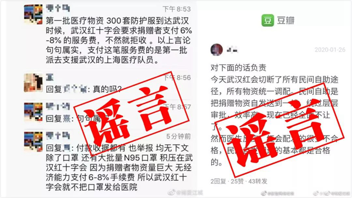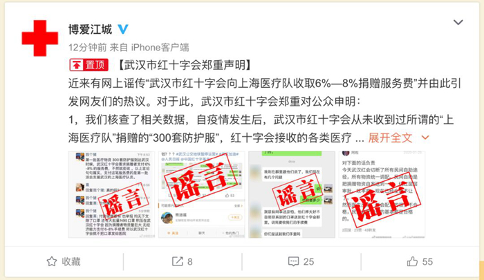 武漢市紅十字會呼吁廣大網友,不要讓謠言玷污了各界愛心企業(yè)和愛心人士的善意之舉,疫情面前,不信謠、不傳謠,眾志成城,共渡難關。